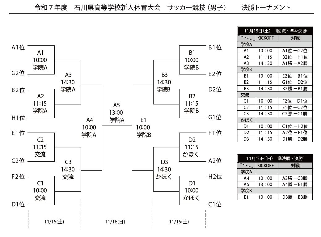 令和7年度 石川県高等学校新人大会サッカー競技 組み合わせ決定 2025.11.06 最終更新日時 : 2025.11.06 nyandaff クリックで拡大できます 新人戦の組み合わせが決定いたしました。 新チームになって間もないですが、勢いを持ってチャレンジしたいと思います。 応援よろしくお願いします。